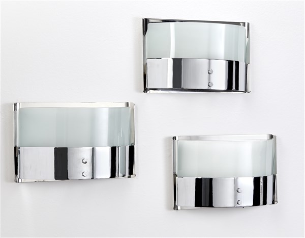 Lotto di tre lampade da parete a tre luci modello "LP19 Monaco". Produzione Azucena, Milano, disegno del 1979, esemplari della metà degli anni '80. Struttura in acciaio e metallo cromato, paralume in vetro trasparente incolore parzialmente acidato sulla superficie interna. (cm 40x25x13) (lievi difetti)