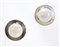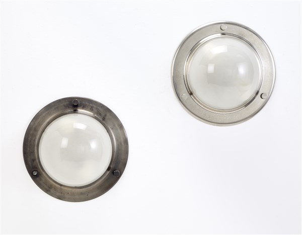Coppia di plafoniere-appliques modello "LSP6 Tommy". Produzione Azucena, Milano, disegno del 1965, esemplari della metà degli anni '80. Struttura in acciaio lucidato, paralume in vetro smerigliato internamente. (d cm 35,5) (lievi difetti e mancanze)