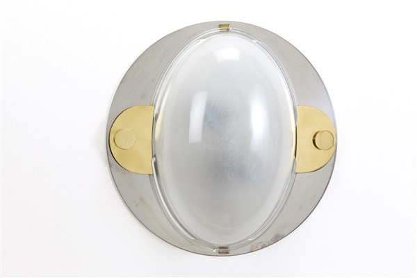 Lampada da parete modello "LSP12 Ovale". Produzione Azucena, Milano, 1982. Piastra in acciaio inossidabile, vetro satinato ovale acidato internamente, borchie in ottone. (d cm 46) (lievi difetti)