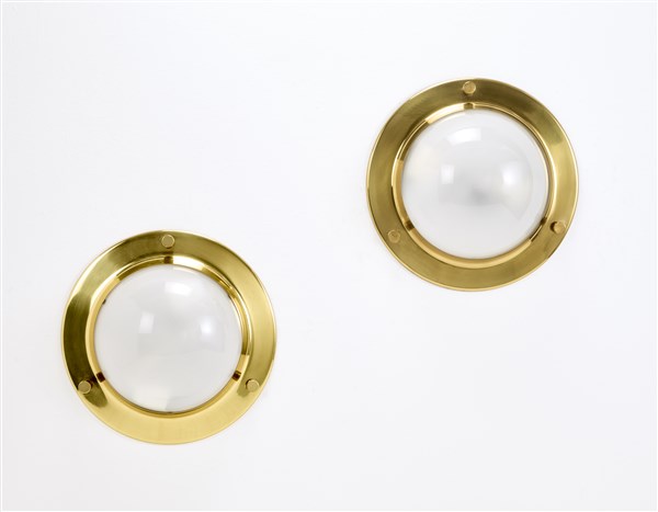Coppia di plafoniere-appliques modello "LSP6 Tommy". Produzione Azucena, Milano, 1965. Struttura in ottone lucidato, paralume in vetro smerigliato internamente. (d cm 35,5) (lievi difetti)