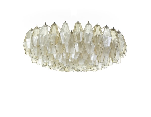 Lampada a sospensione a poliedri. Venini, Murano, 1958ca. Vetro soffiato in stampo trasparente incolore e pagliesco, struttura in metallo verniciato bianco. (d cm 65) (lievi difetti)
