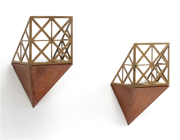 Coppia di lampade da parete in lamina di ottone e fusione di ottone. Milano, anni '80. (cm 20,3x41,5x20,5) (lievi difetti e restauri)