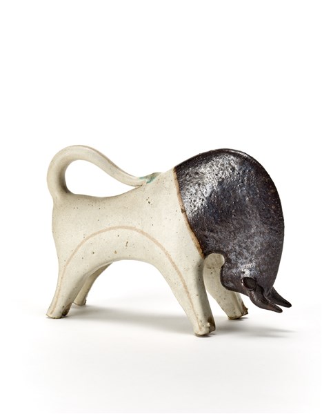 Scultura raffigurante un toro piccolo. Firenze, seconda metà secolo XX. Grès smaltato in bianco e nero opaco e graffita. Firmato. (cm 6x11,5x17)