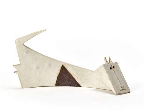 Scultura raffigurante un gatto coricato. Firenze, seconda metà secolo XX. Grès smaltato in bianco opaco e graffita. Firmato. (cm 6,6x18,5x35)