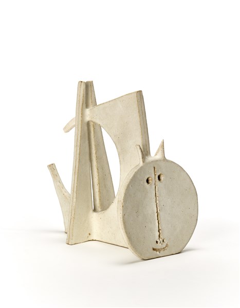 Scultura raffigurante un gatto grande. Firenze, seconda metà secolo XX. Grès smaltato in bianco opaco e graffita. Firmato. (cm 14x23x22,5)