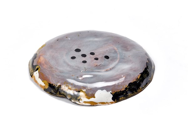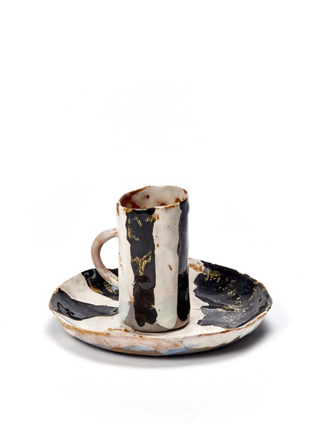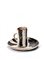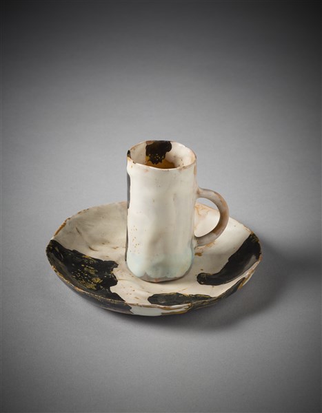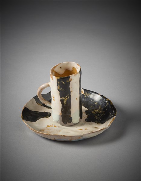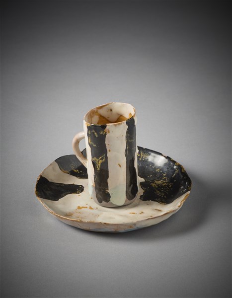 Tazzina e piattino in ceramica modellata a mano e smaltata in grigio, bianco opaco, nero, ocra e celeste. Milano, 1950ca. Entrambi firmati con i sette punti neri. (tazzina cm h 7; piattino cm d 12) (lievi difetti)