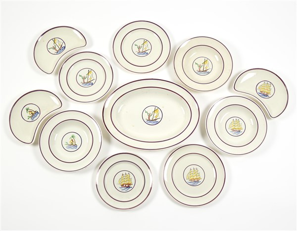 Parte di servizio della serie "Velesca". Manifattura Richard - Ginori, Milano, anni '20. Tre mezzelune, un piatto da portata, tre piatti fondi, due piatti piani e due piattini in ceramica smaltata. Marcato sotto la base e con firma “Velesca”. (lievi difetti)