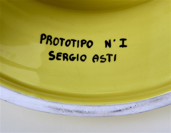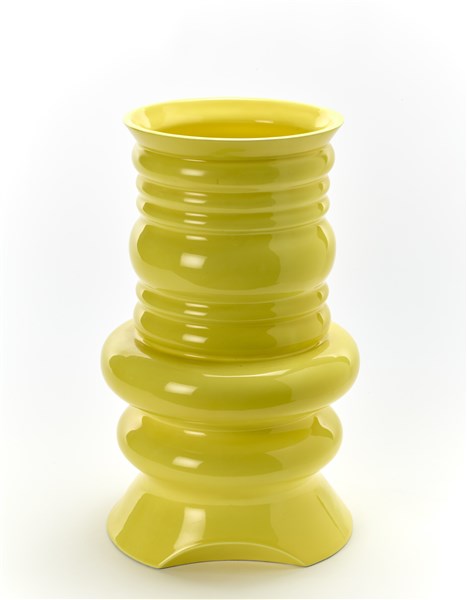 Vaso cilindrico diviso in dieci settori. probabile produzione Gabbianelli, Cusano Milanino, anni '60/'70. Ceramica smaltata in giallo sotto vetrina. Firmato e numerato sotto la base “PROTOTIPO N. 1 SERGIO ASTI”. (h cm 42)