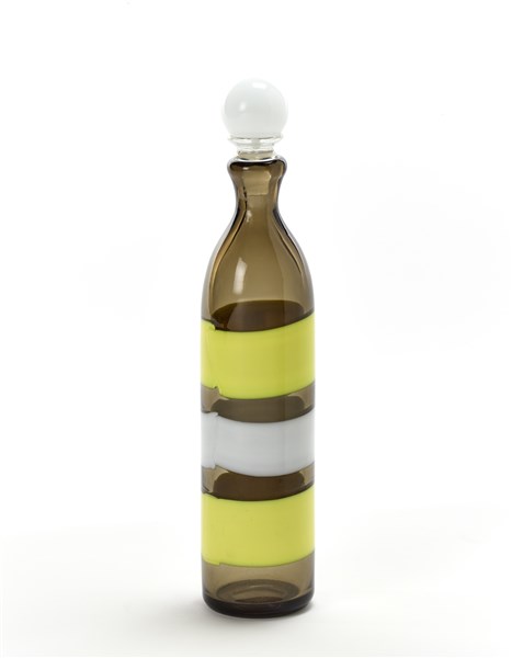 Bottiglia con tappo della serie "A fasce orizzontali". Venini, Murano, anni '60/'70. Vetro fumè con fasce giallo e lattimo, tappo in vetro trasparente incolore e lattimo. Firmato a punta sotto la base "Venini Murano". (h cm 40) (lievi difetti)