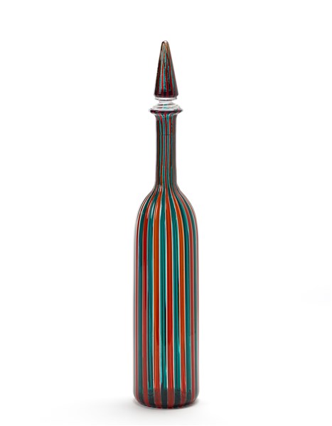 Bottle with cap model "526.10". Murano, 1960s/1970s. Blown glass with transparent red and green reeds. Signed under the base "Venini italia". (h 46.5 cm.)