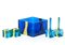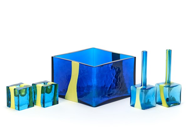 Lotto composto da due vasi soliflore / bottigliette, due portacandele e un grande vaso quadrangolari in vetro azzurro con fascia applicata in vetro giallo opaco. Murano, 1969-70. Firmati a punta sotto la base. (misure diverse) (difetti e restauri su una bottiglia e mancanza dei tappi alle due bottiglie)