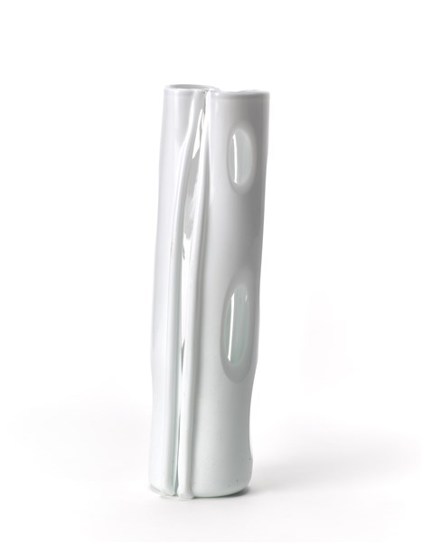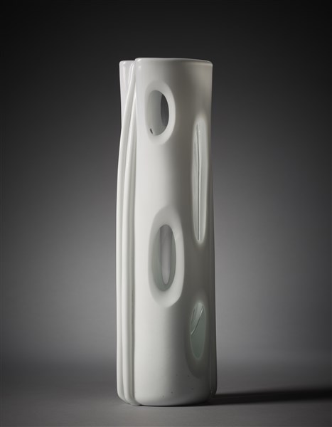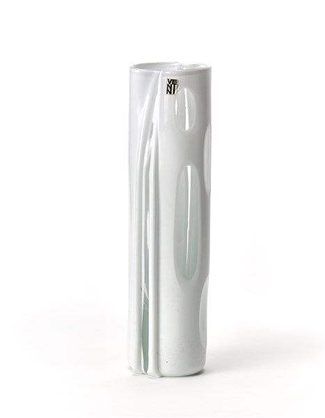 Vaso della serie "Scolpito". Venini, Murano, 1965. Vetro soffiato cristallo e lattimo con molature circolari. Firmato a punta sotto la base. (h cm 30)