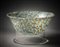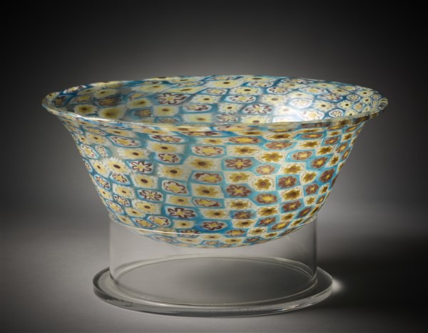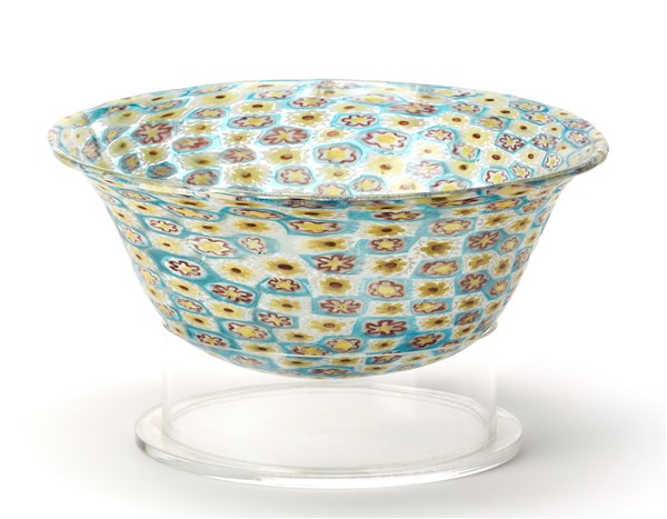 Grande cratere in vetro soffiato a murrine millefiori lattimo, ametista celeste e giallo. Murano, anni '10/'20. Con supporto in plexiglas. (d cm 40,5)