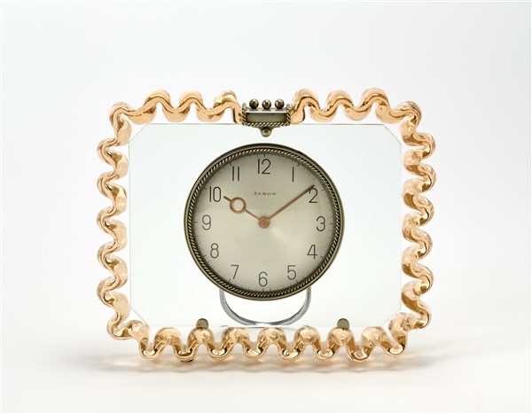 Orologio da tavolo AKROM con cornice in vetro ondulato soffiato massello trasparente rosa chiaro e montatura in ottone nichelato. Murano, anni '30/'40. (cm 31x24,5) (lievi difetti)