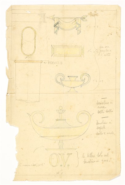 Study for Novecento decorative elements in bronze to be applied to furniture, probably conceived to decorate the furnishings of Villa Vittoria in Florence, commissioned by the Counts Contini-Bonacossi. Milan, 1930ca. Detailed technical drawings, sections. Handwritten notes by the author's hand Graphite, blue ink, yellow and brown pastel on dusting paper. (27.2x18.2 cm.) (defects)