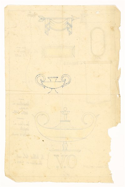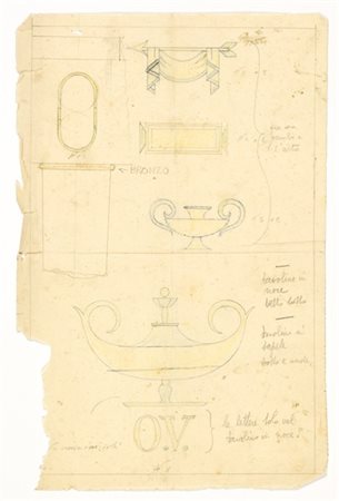 Studio per elementi decorativi di gusto Novecento in bronzo da applicare a mobili, concepiti probabilmente per decorare gli arredi di Villa Vittoria a Firenze, commissionati dai conti Contini-Bonacossi. Milano, 1930ca. Disegni tecnici di dettaglio, sezioni. Note manoscritte di pugno dell'autore Grafite, inchiostro blu, pastello giallo e marrone su carta da spolvero. (cm 27,2x18,2) (difetti)