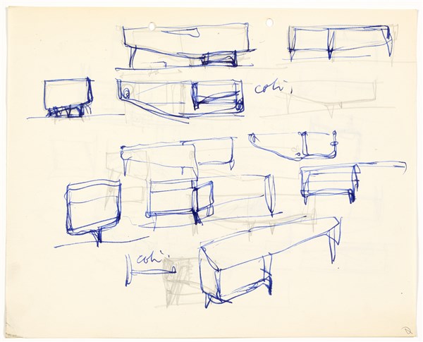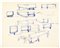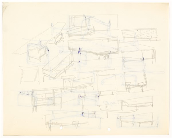 Studies for desks and equipped walls, among which a variant of the desk model created for Gianni Mazzocchi is recognizable. Milan, 1951ca. Numerous freehand sketches, recto/ verso. Graphite and blue ink on "Roma Tenax P.M.F." watermarked paper. (22x27.8 cm.) (slight defects)