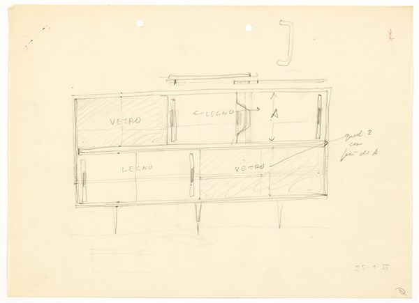 Study for sideboard in wood, glass and brass, with parallelepiped body on fusiform legs divided into two horizontal sections with sliding doors. Milan, 25 gennaio 1955. Freehand drawing and handwritten notes by the author's hand. Graphite on "Paper Chinese" watermarked paper. Front / back. Dated lower right. (21x29.6 cm.) (slight defects)