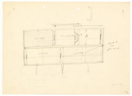 Studio per credenza in legno, vetro e ottone, con corpo parallelepipedo su gambe fusiformi diviso in due sezioni orizzontali ad ante scorrevoli. Milano, 25 gennaio 1955. Disegno a mano libera e note manoscritte di pugno dell'autore. Grafite su carta filigranata "Paper Chinese". Recto/verso. Datato in basso a destra. (cm 21x29,6) (lievi difetti)