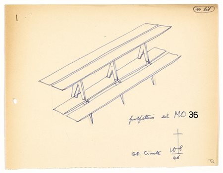 Studio per un tavolo in legno, probabilmente destinato alla produzione Apem. Civate, 10 agosto 1946. Disegno assonometrico a mano libera. Note manoscritte di pugno dell'autore. Grafite e inchiostro blu su carta filigranata "Extra Forte". Firmato "GP.", locato e datato in basso a destra. (cm 17,7x23,4) (lievi difetti)