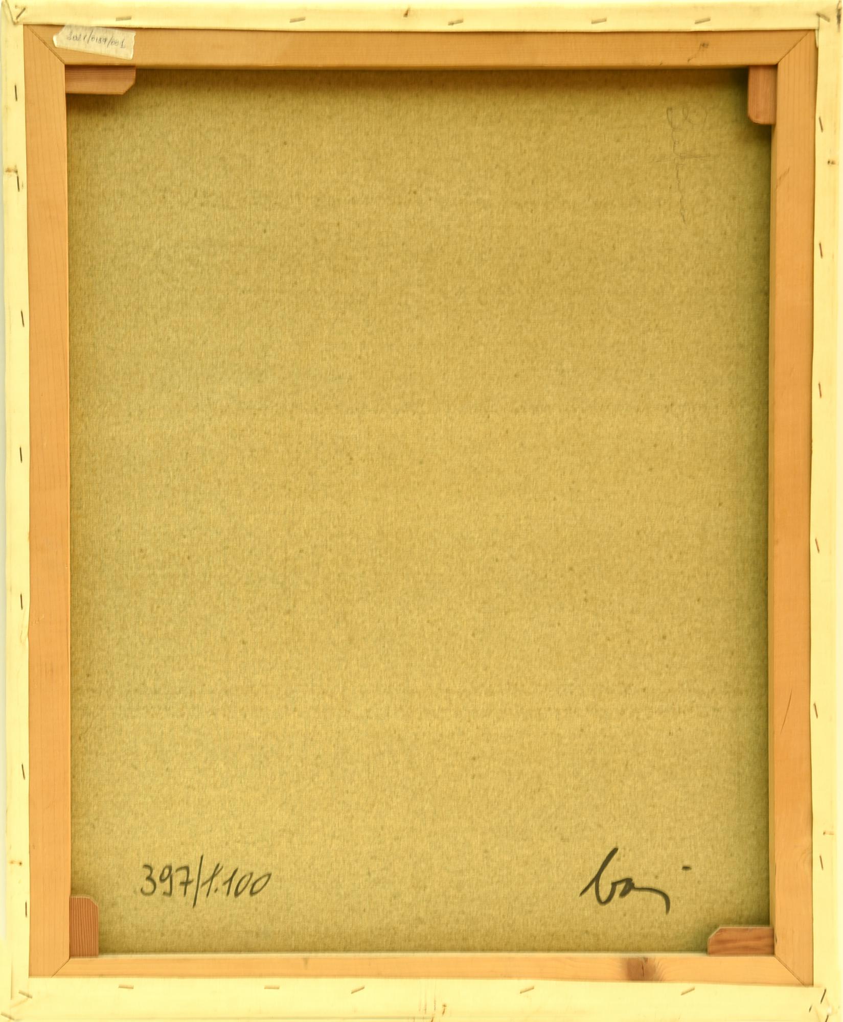 serigrafia polimaterica su tela con applicazioni, cm 77x62; es. 397/1.100