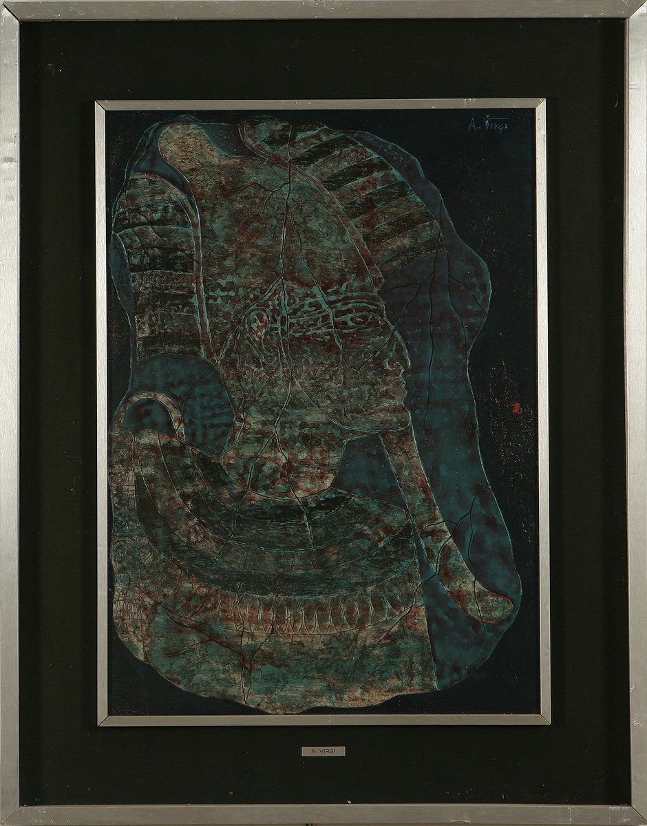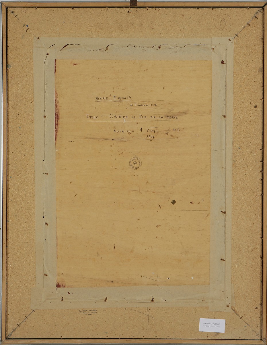 VIRGI A. Osiride, dio della morte. 1974. Tempera su tavola. Cm 50,00 x 70,00. Al retro titolo, firma, anno e timbro della Galleria Mazzini di Brescia.
