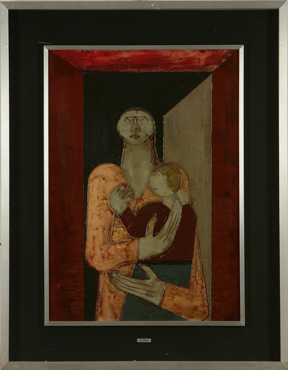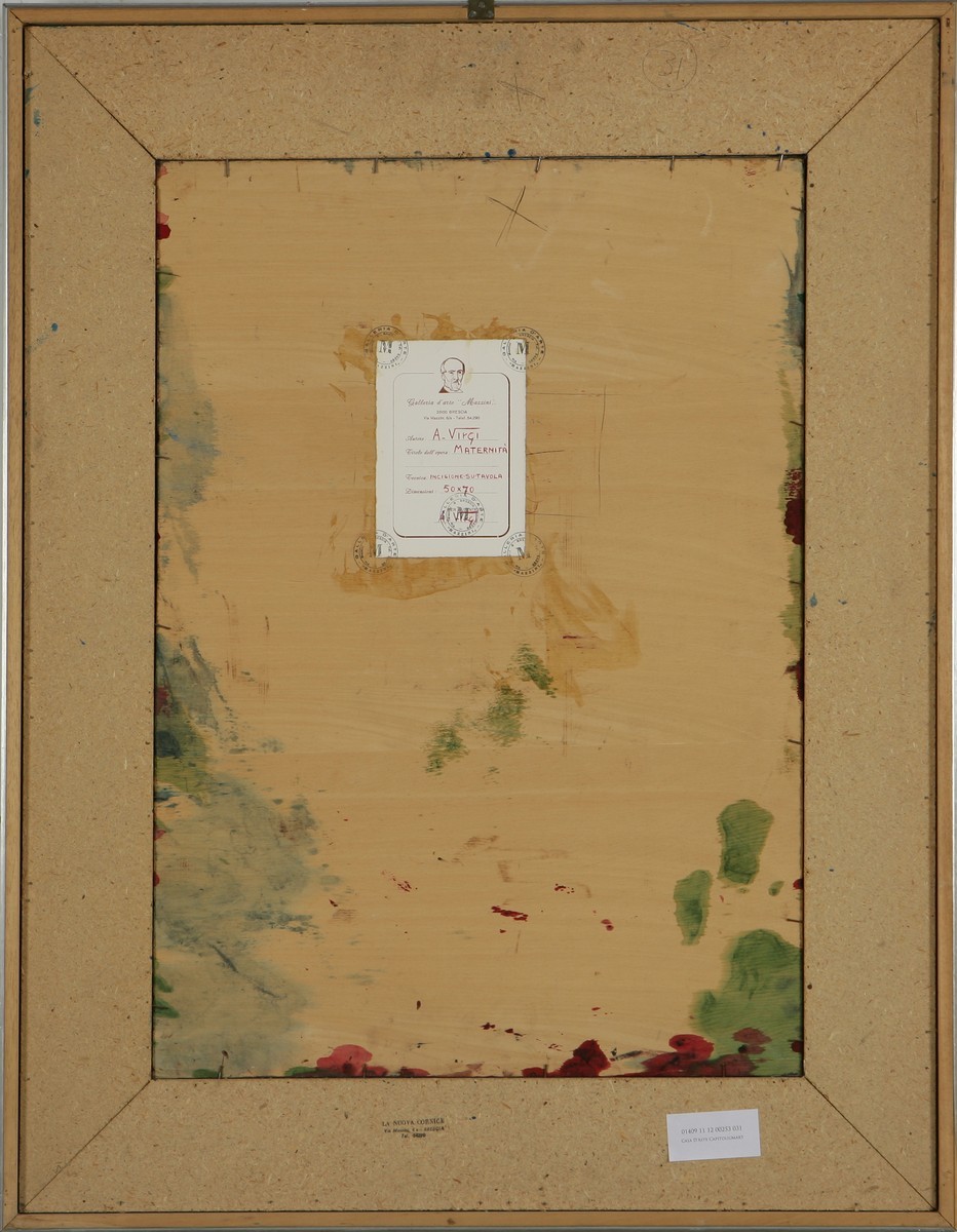 VIRGI A. Maternità. Olio su tavola. Cm 50,00 x 70,00. Al retro firma, titolo e timbro della galleria Mazzini di Brescia. Firma in basso a destra. Cornice presente