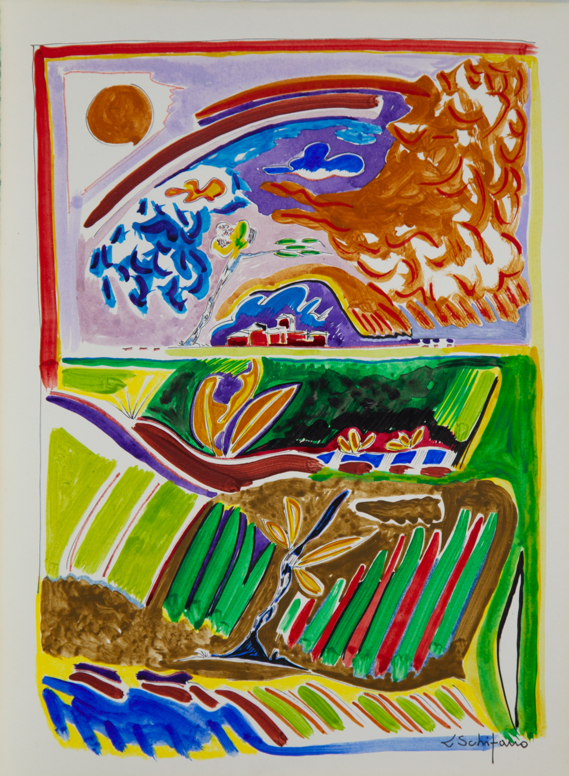 LUCIANO SCHIFANO'Campagna con case'tecnica mista su cartaanno 1974cm 32x23firmata in basso a destraal retro: firma, titolo e anno
