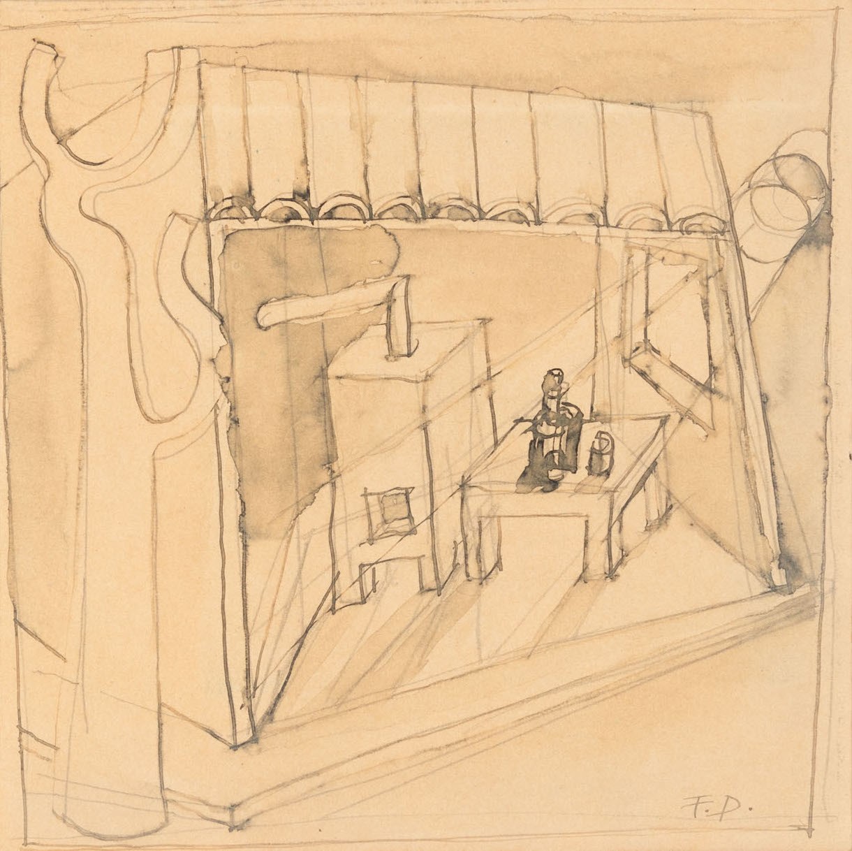 Dopo il suo rientro da New York (nel 1930) dove aveva visto realizzato tutto quello che i futuristi sognavano, Depero si richiuse nel suo Trentino e la sua pittura divenne via via sempre più “rustica”. Poi, nel 1941, Depero si rifugia a Serrada, paese sull’altipiano di Folgaria, per sfuggire ai bombardamenti in Valle dell’Adige, e durante il soggiorno in montagna, spesso riprende vecchi temi, e li rifà alla nuova maniera. E così fu per un dipinto del 1932 titolato “Prismi lunari” nel quale una casa era sezionata in modo tale da vedere gli interni e come sospesa nello spazio, il tutto in una cupa luce blu lunare e con la luna che occhieggiava dalla finestre. Quadro ancora del tutto futurista, ed anche un po’ metafisico, mentre in questo disegno, seppur con la stessa ispirazione, il contesto è altro... ed è appunto l’albero, secco, sulla sinistra a riportarci sulla Terra.