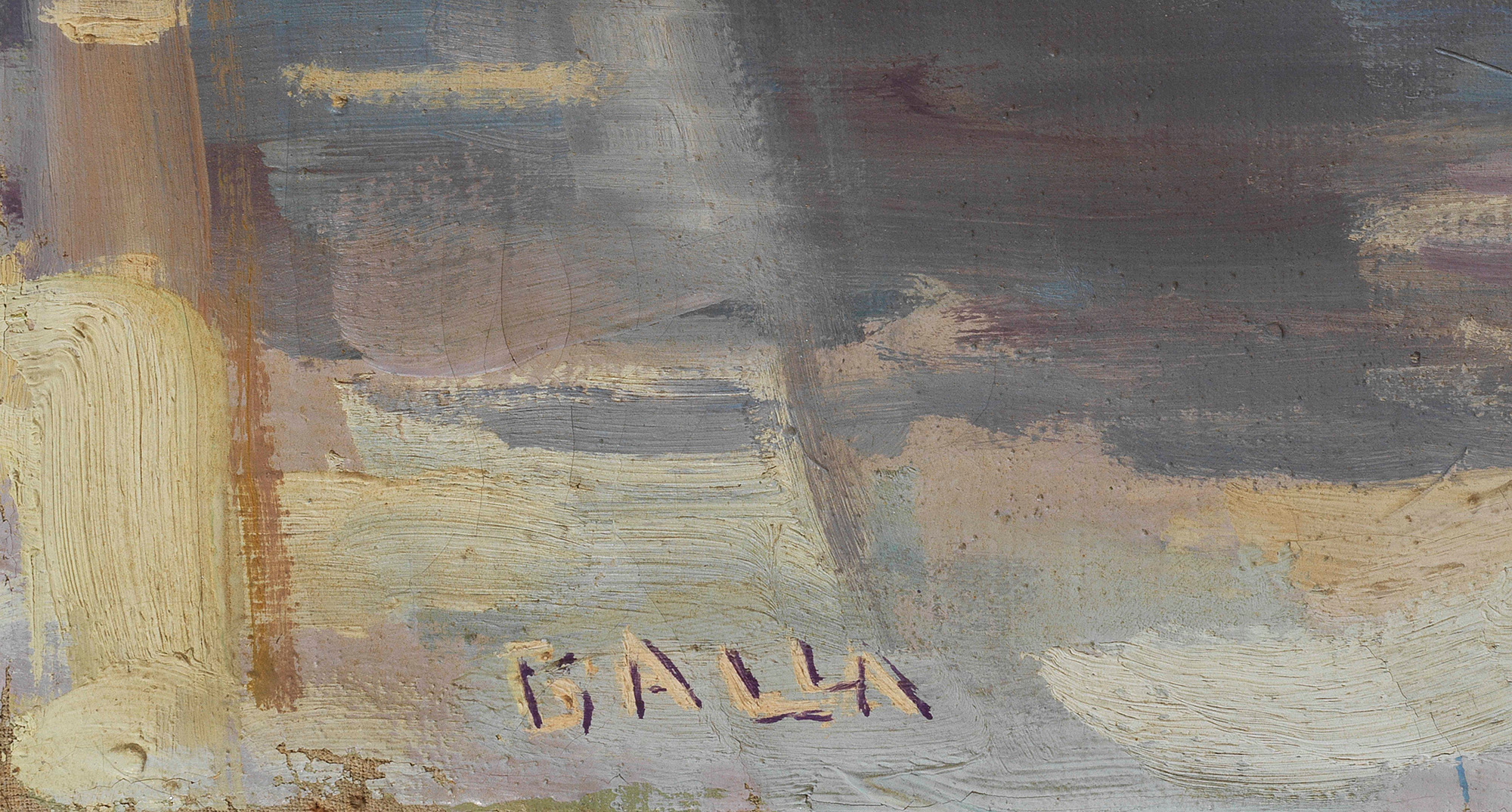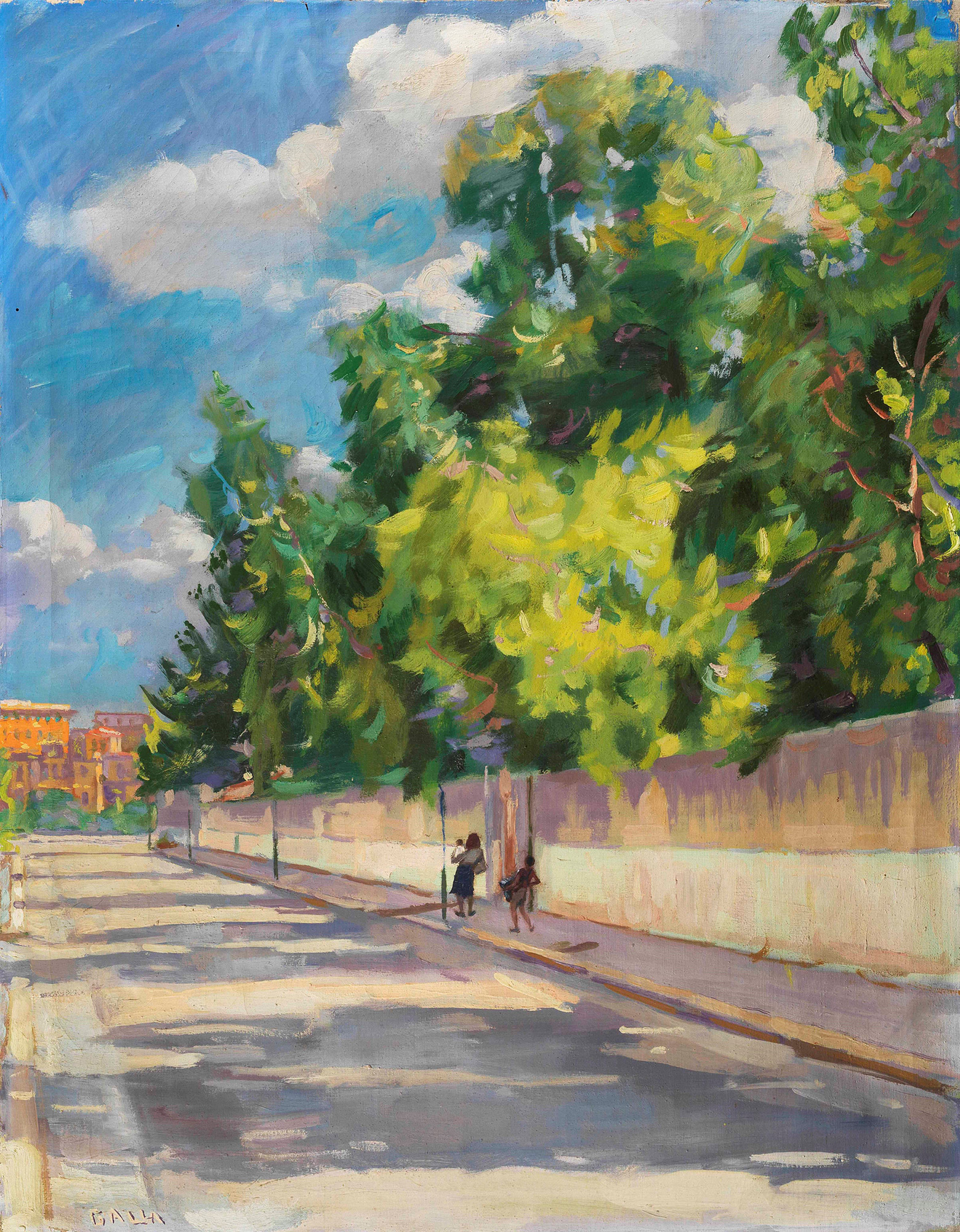 Il pittore completo che ama la verità eterna è nell’espressione della NATURA, quando viene pittoricamente suggestionato da essa, le correnti trasmissive sono ingenuamente prive di qualunque scuola, metodo, regola, maniera ecc. e sono verginalmente sincere si legge in uno dei taccuini scritti da Balla appena arrivato a Roma dalla natia Torino nel 1895. E ancora, ma quello che ama il cielo, il mare, l’infinito luminoso, i fiori, i viali, la terra, gli animali tutti, allora amerà pur me perché vitalizzato dagli stessi elementi. Nel giugno del 1929 la famiglia Balla si trasferisce nell’abitazione romana di via Oslavia 39b, una casa popolare nel quartiere Delle Vittorie non poco distante dal Convitto Nazionale Vittorio Emanuele II. Sempre col pennello in mano e lo sperimentalismo nel cuore, Balla vi resterà fino alla morte, avvenuta il 1 marzo 1958. Nel 1937 Balla declama la sua convinzione che l’arte pura è nell’assoluto realismo, senza del quale si cade in forme decorative, ornamentali, perciò ho ripreso la mia arte di prima: interpretazione della realtà nuda e sana che attraverso la spontanea sensibilità dell’artista è sempre infinitivamente nuova e convincente. “E’ dell’Ottocento ed è di domani; continua il filone d’oro della miniera che nasce dalla verità naturale animata dal mistero della creazione, perpetua l’ansia che è nell’uomo designato. Il pittore lo ripete spesso: la visione è chiara, la verità è presente. Egli è giunto dopo lunghi anni di nobile tirocinio alla conoscenza della forma e della luce, a esprimere questa in armonia con dignità plastica preziosa. I maestri di Balla sono: la verità la tenacia l’amore”, scrive il giornalista Guida nel 1942., In questo olio Giacomo Balla “questa volta [primavera del 1947] vuole fare un quadro più grande; mia sorella lo accompagna. È una stradina con un muro sormontato da grandi eucaliptus, c’è l’aria limpida di primavera, i verdi teneri, l’azzurro pulito, nuovo del cielo e nella Via la ‘macchietta’ di una donna con un bimbo in braccio e un ragazzo che suona l’organetto: ultimi cenni di una vita che va scomparendo; ma è la trasparenza delle ombre in prospettiva che lo appassiona, è la qualità dell’azzurro del cielo, è un quadro d’aria aperta non facile per i più: questa luce chiara, negli ultimi dipinti, non è cosa comprensibile alle menti abituate alla usualità della pittura mediocre; tuttavia quando l’arte è grande c’è sempre quell’uno che la comprende” (da Elica Balla, Con Balla, Milano 1986, vol. III, pag.269). La scena è ambientata in via Carlo Ederle, lungo il muro del Convitto Nazionale Vittorio Emanuele II verso il Lungotevere della Vittoria. In fondo, infatti, come macchia di colore arancione, si possono riconoscere gli edifici illuminati dal sole romano appena costruiti sul Lungotevere Flaminio. E’ lo stesso Balla con il titolo scritto sul retro della tela - Non più silenzio – ad accompagnarci dentro quella luminosa passeggiata nei pressi di casa sua a Roma: le grandi chiome degli alberi catturano la luce attraverso l’uso dei colori luminosi dell’arancio e del verde con il giallo contro l’azzurro della primavera romana. L’olio proviene direttamente da Casa Balla, dove il produttore cinematografico Elio Scardamaglia (Amelia 1920 – Londra 2001) lo acquista all’inizio degli anni Ottanta., Roma 12 novembre 2021 In fede Elena Gigli