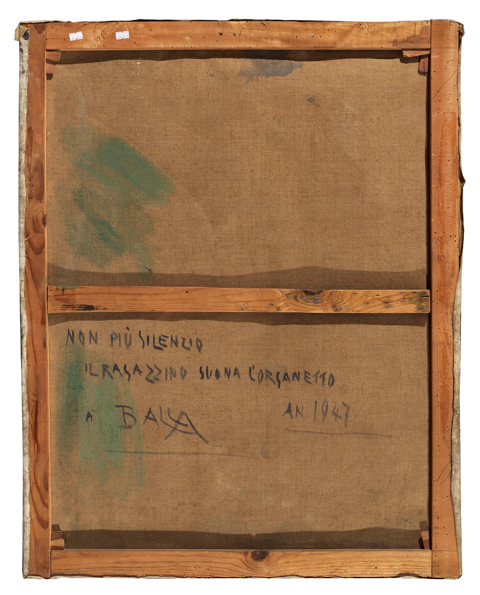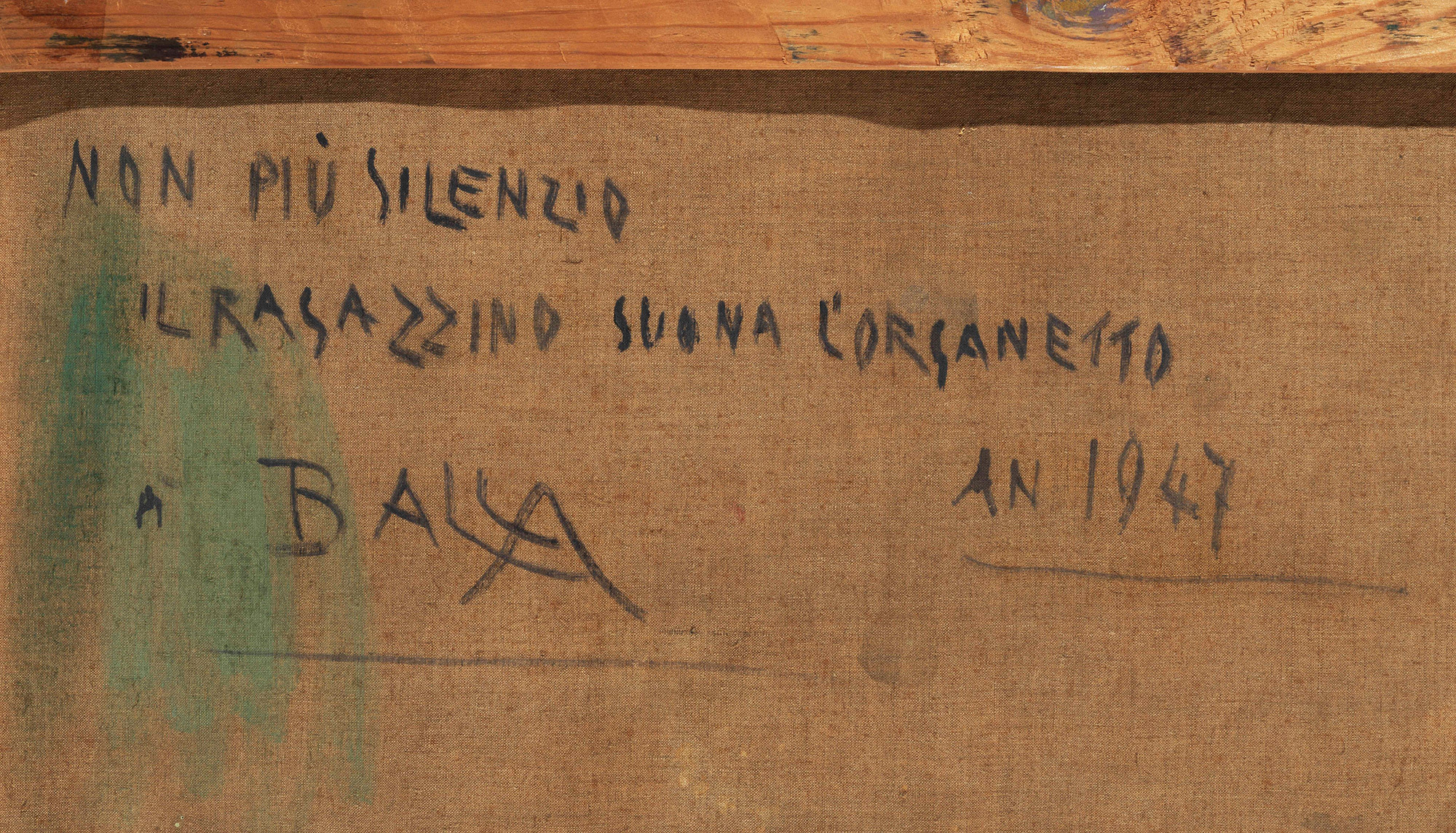 iscritto al retro: NON PIU’ SILENZIO \ IL RAGAZZINO SUONA L’ORGANETTO \ DI BALLA \ AN. 1947