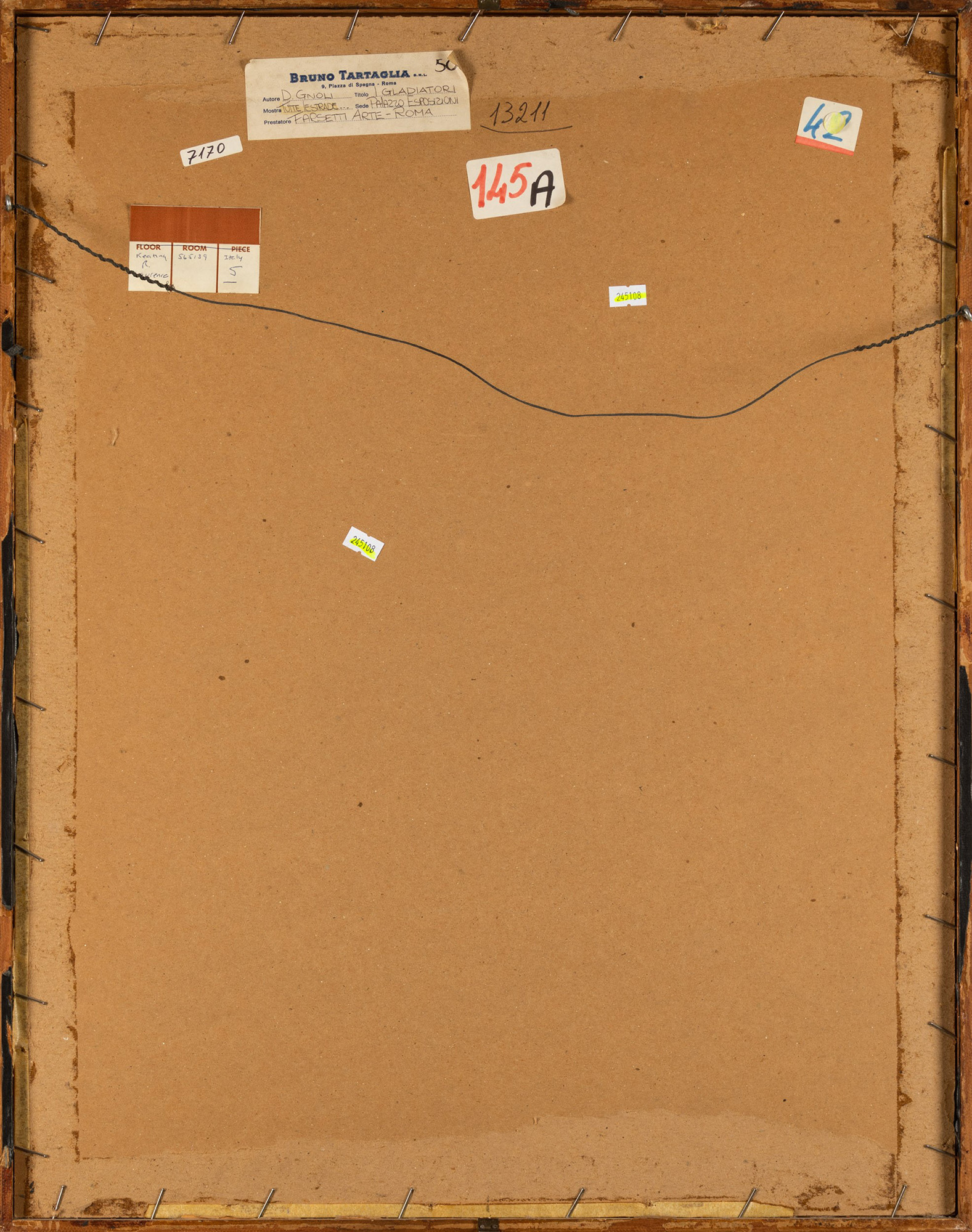 Etichetta al retro della ditta di Trasporti Bruno Tartaglia in Roma, la quale cita Palazzo Delle Esposizioni il titolo "Gladiatori" e la mostra "Tutte le Strade portano a Roma?" presso Palazzo Esposizioni, citando come prestatore Farsetti Arte - Roma