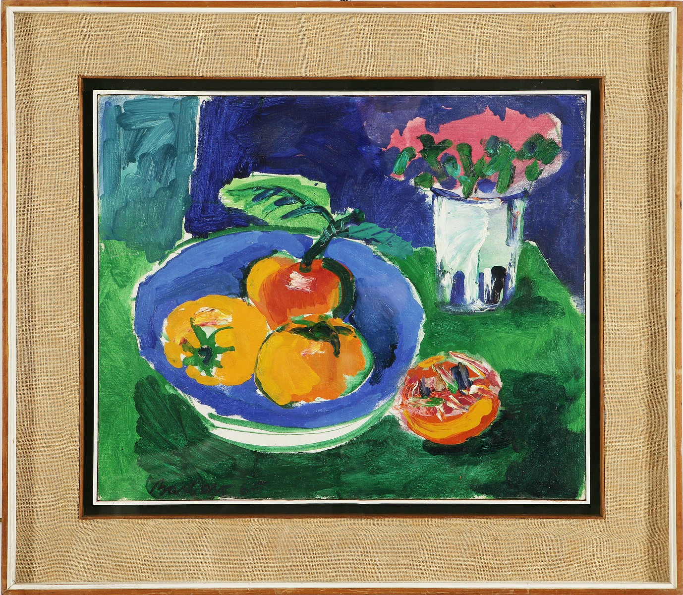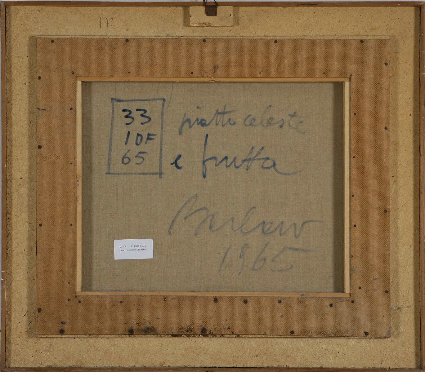 BARBARO SAVERIO (n. 1924) Piatto celeste e frutta. 1965. Olio su tela . Cm 56,00 x 46,00. Al retro titolo, firma e anno. Firma in basso a sinistra. Cornice presente