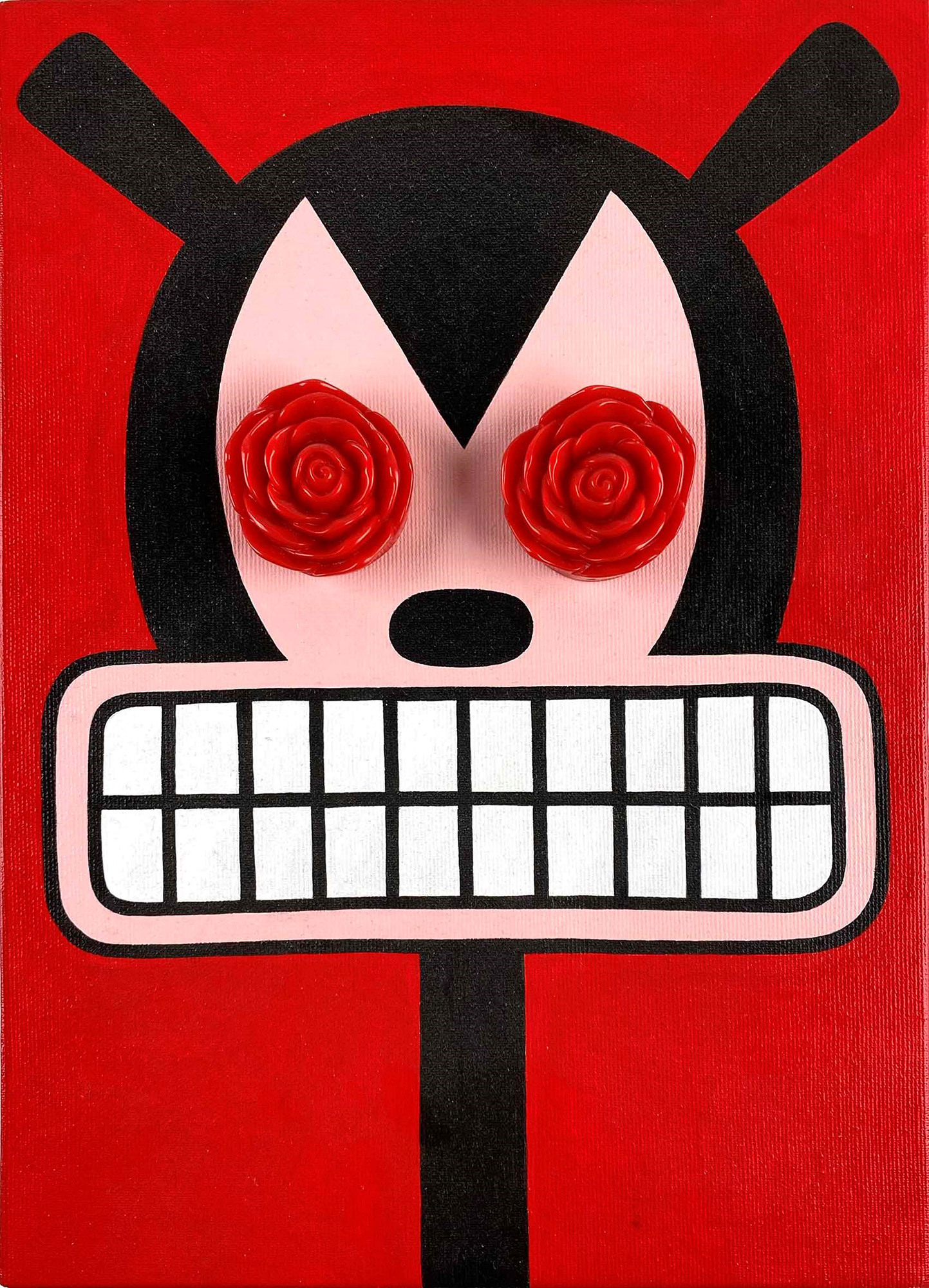 Acrilico e rose di plastica su tela.