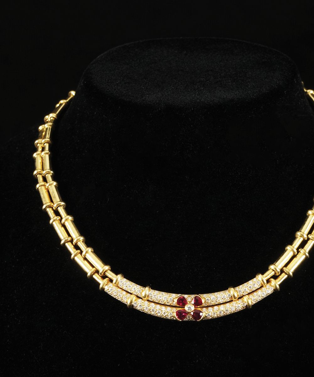 Collier in oro giallo 18kt. a doppia fila di elementi tubolari: al centro una corolla quadripetala di rubini fra piccoli brillanti, l. cm. 39, peso gr. 77
