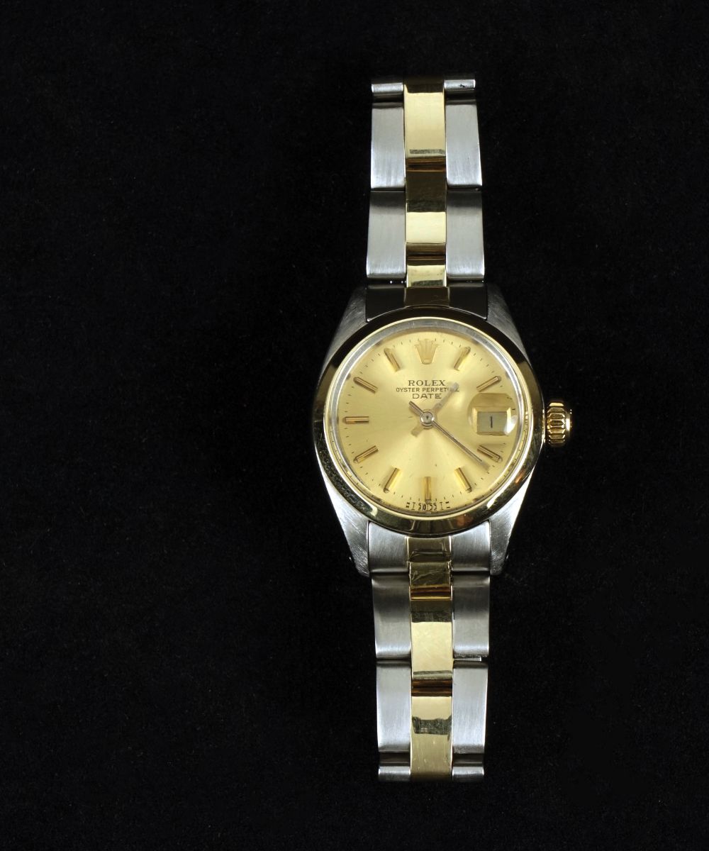 Rolex Date “Lady” ref. 6916. Cassa a tre corpi in acciaio e oro con lunetta liscia e bracciale oyster. Movimento meccanico a carica automatica con calendario, cal. 2030. Vetro plexy e quadrante champagne. Diametro 26mm., seriale nº 5058xxx del 1977