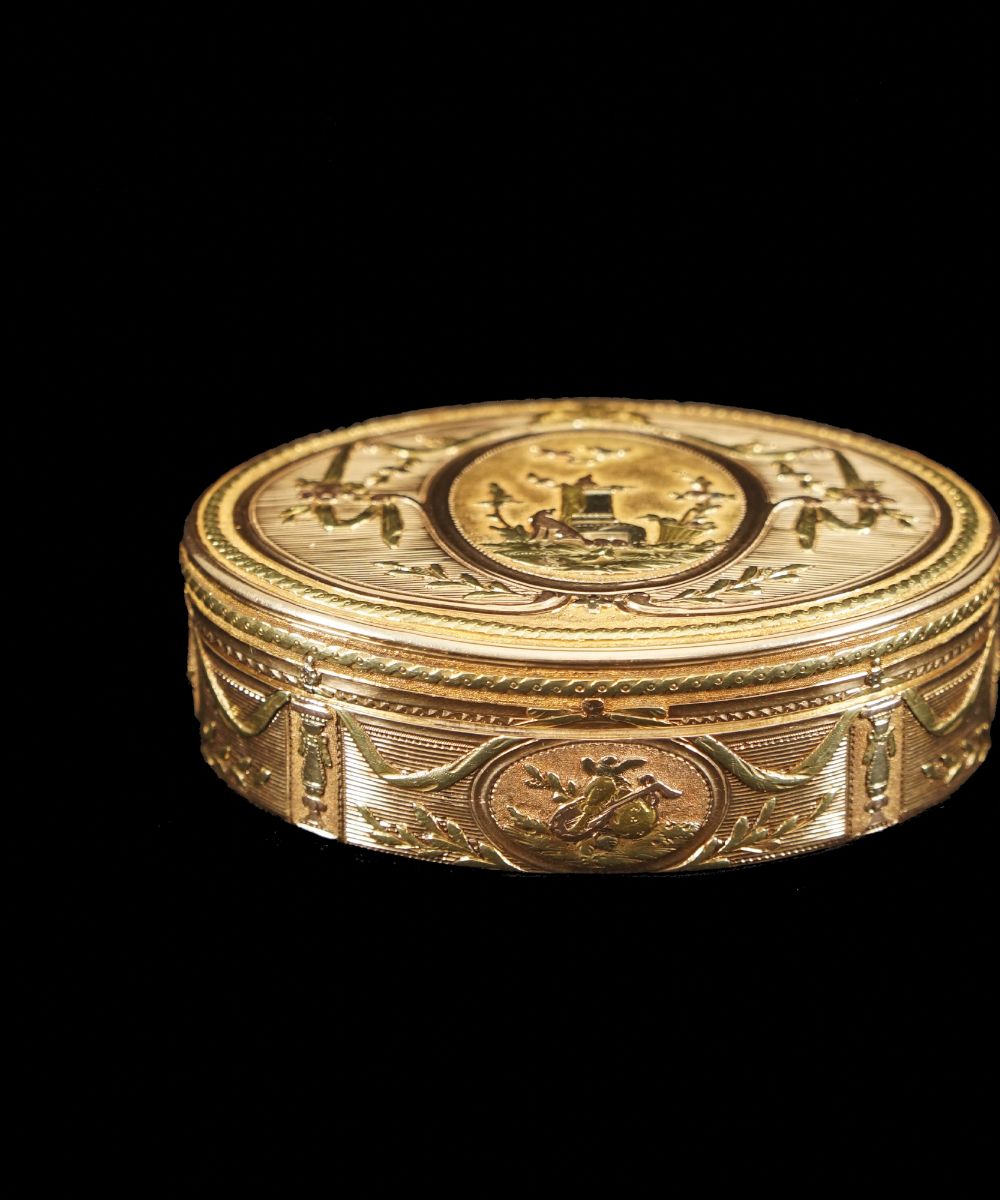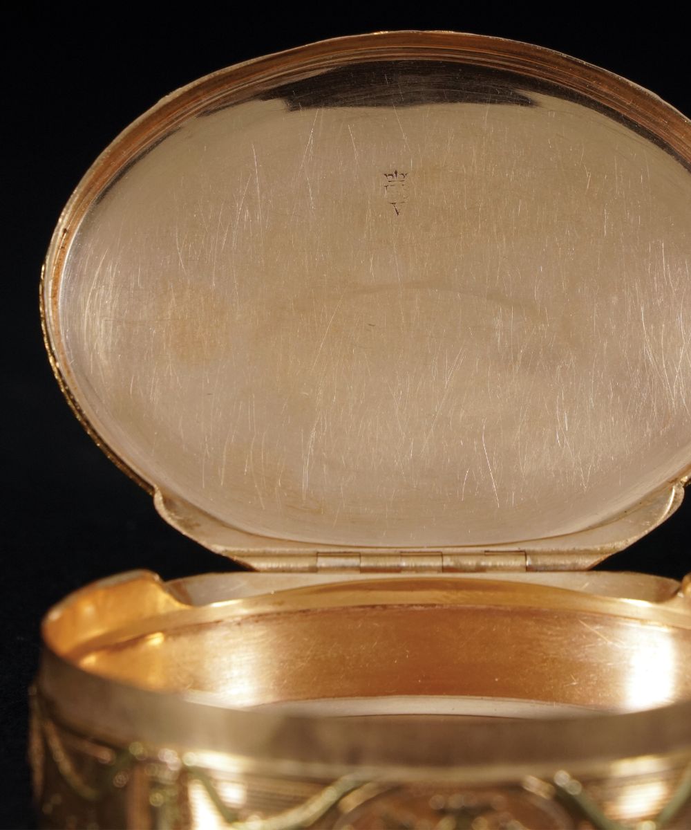 Tabacchiera di forma ovale in oro giallo e rosa 18kt. finemente cesellata a motivi neoclassici tra festoni di foglie e fiori e nastrini infiocchettati.
