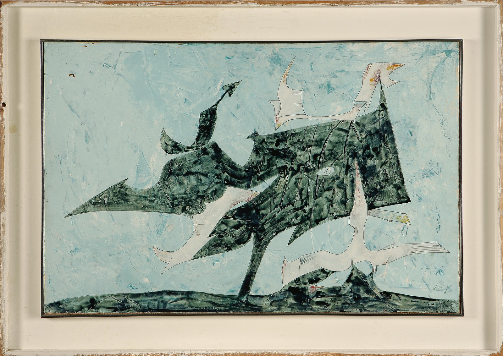 DOVA GIANNI (1925 - 1991) Senza titolo. Tecnica mista su carta su tela. Cm 75,00 x 50,00. Opera registrata presso l'Archivio Gianni Dova, Milano, come da documentazione fotografica allegata riportante il relativo numero d'inventario. Firma in basso a destra. Cornice presente