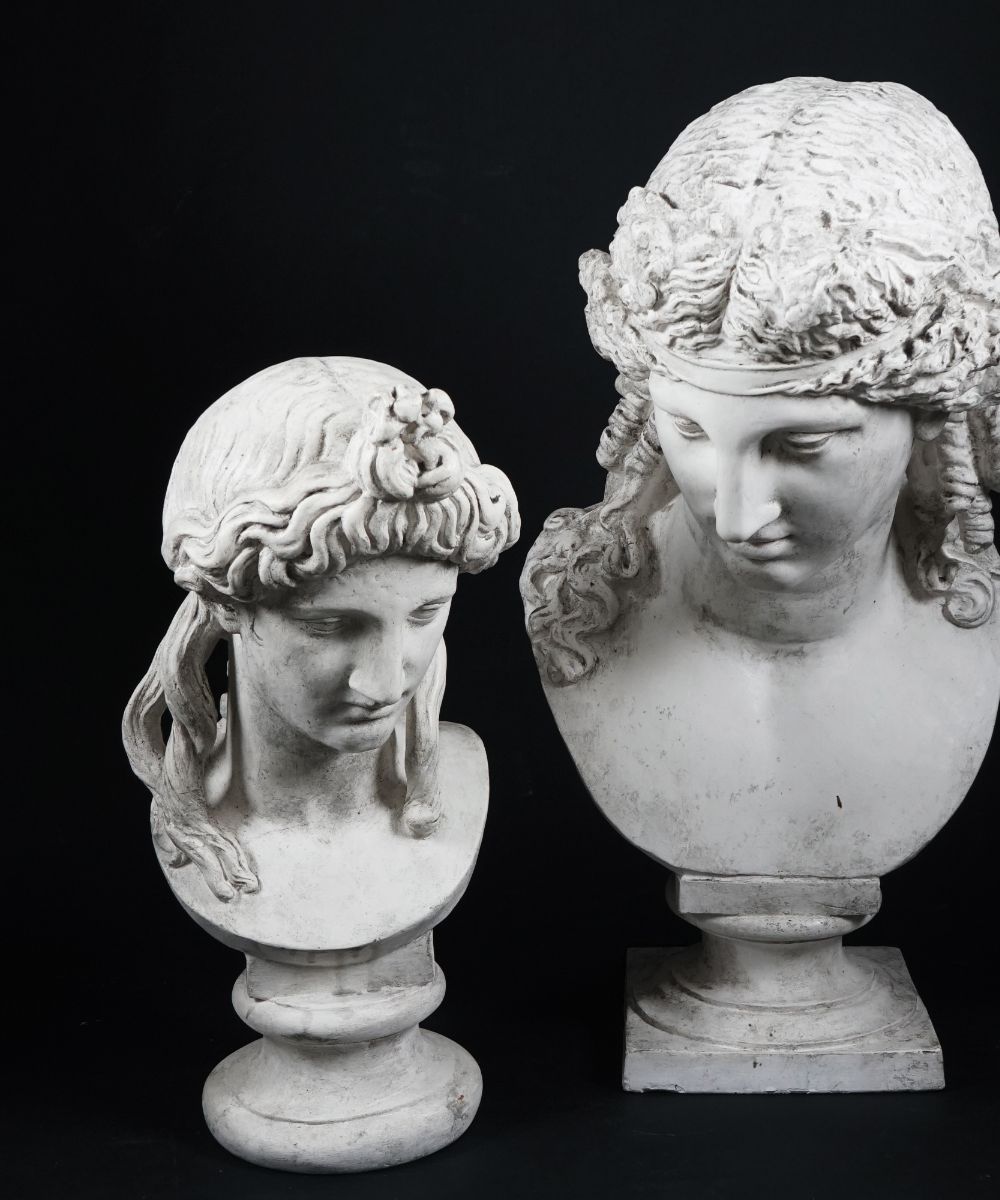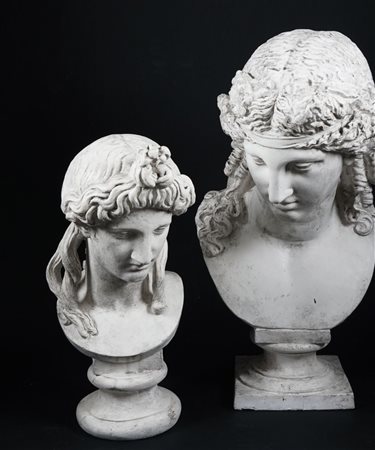 Due sculture in gesso raffiguranti ciascuno un busto classico, h. cm. 53; h. cm. 70