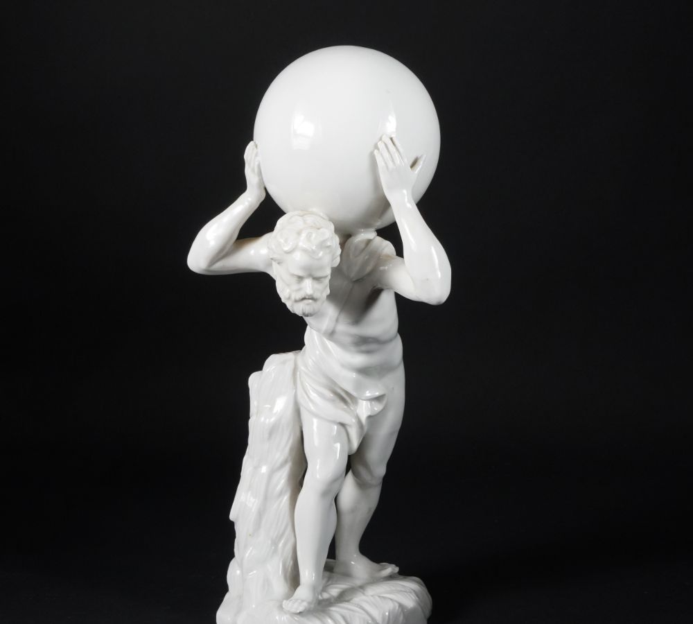 Scultura in porcellana bianca raffigurante Ercole o Atlante. Furstenberg,...