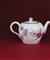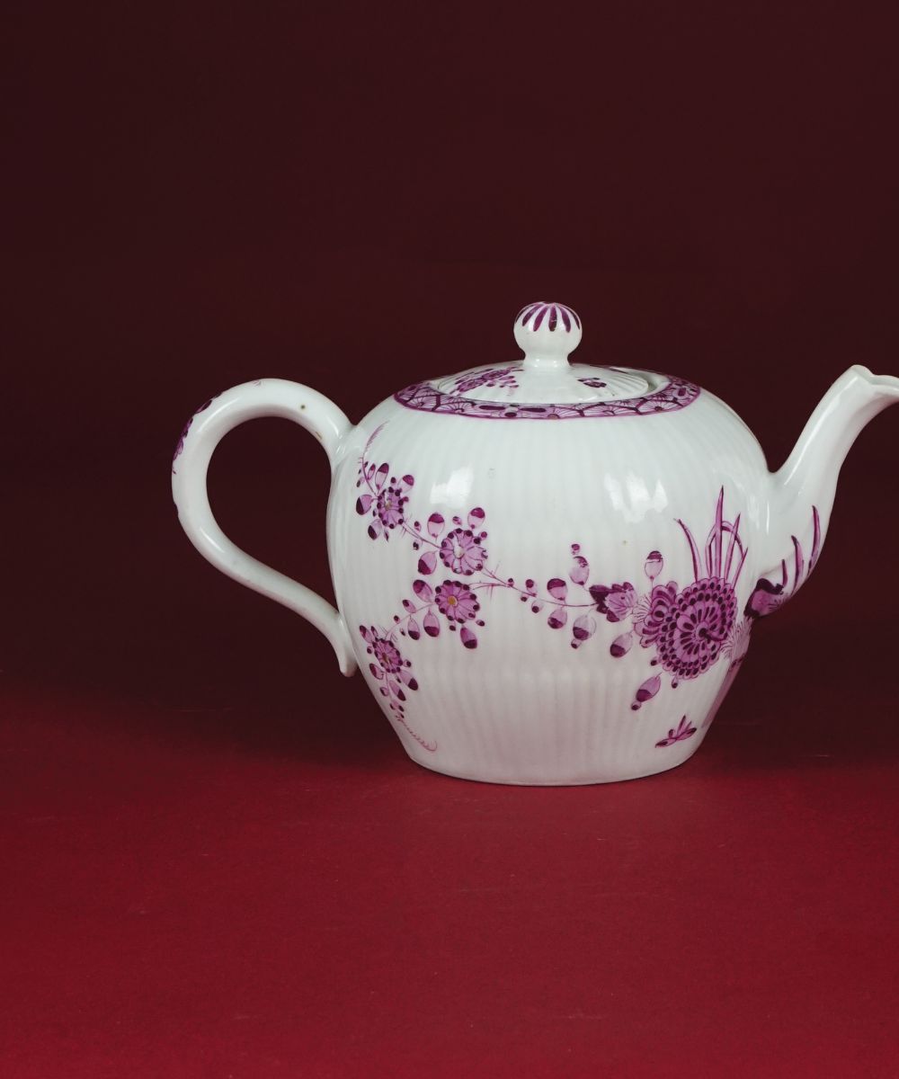 Teiera in porcellana bianca. Corpo globulare modellato a fitte costolature (Gebrochener Stab), dipinto a raffinati motivi floreali di ispirazione orientale detti Aehrenmuster (oppure Hechenmuster) nei toni del viola.