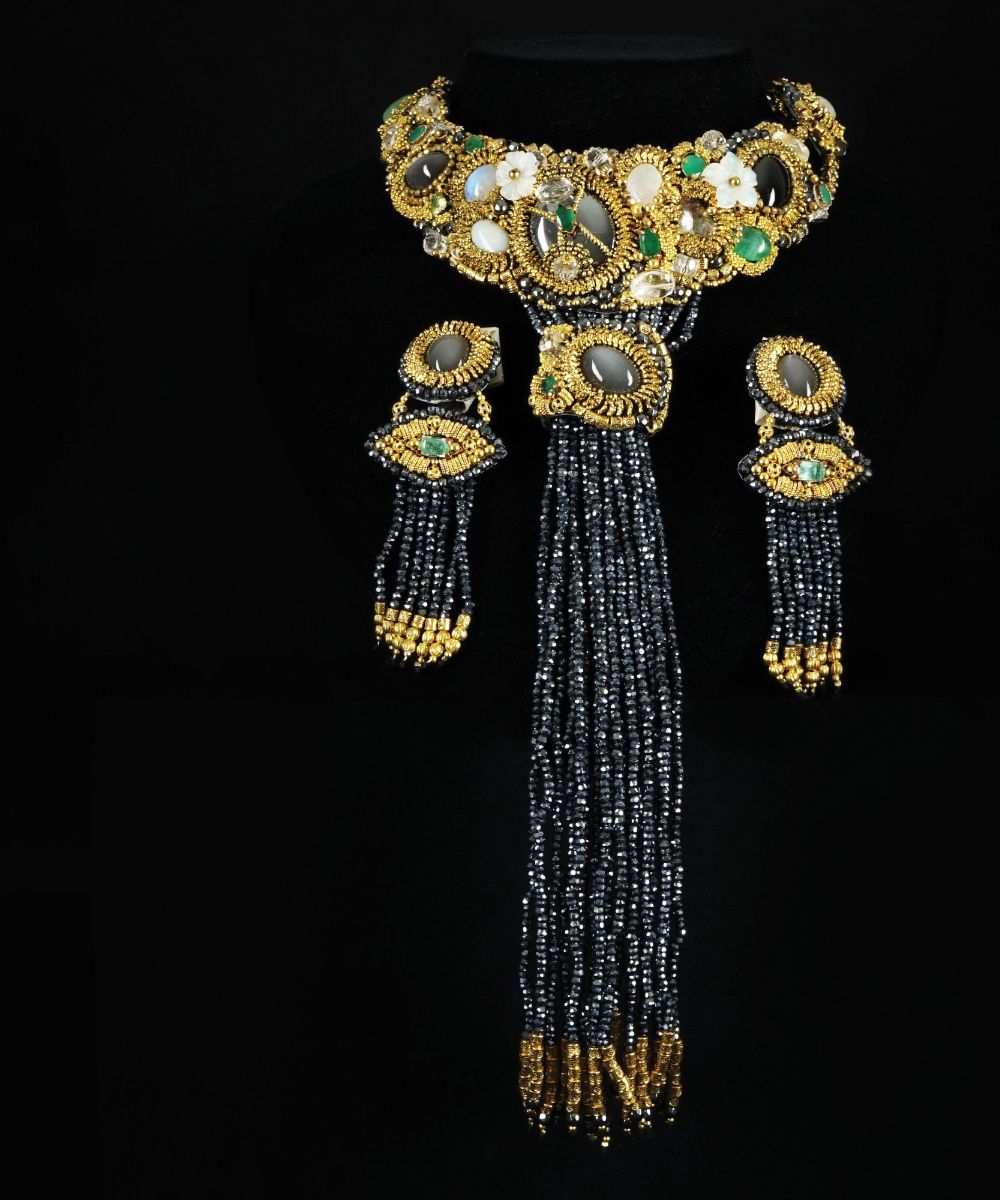 Moon Asteria collana con cabochons di moon stones stellati, cabochon di ematite, smeraldi, opali incise e cabochon, tormaline. Fili e fiocco di perle spinello nero; orecchini en suite, la collana l. cm. 37; gli orecchini h. cm. 10