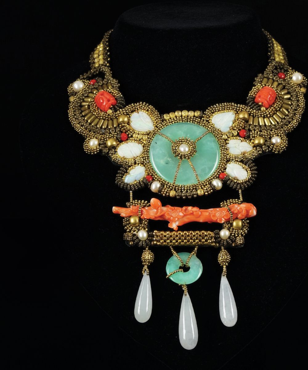 Lot 215 | Giardino Orientale collana con due dischi in giada, corallo scolpito, perle,...