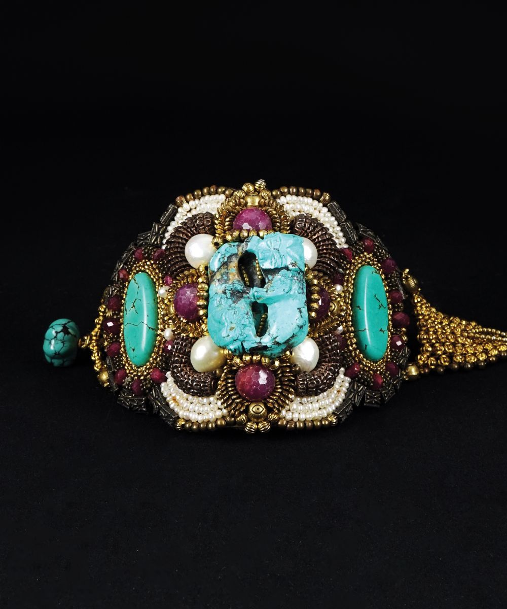 Bracciale con turchesi, scultura centrale in turchese, perle di rubino e...
