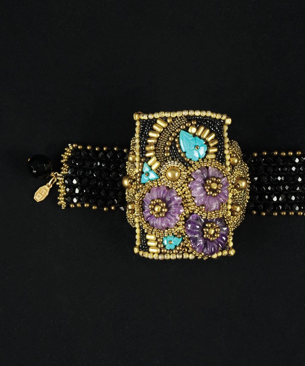 Bracciale decorato con ametiste incise a fiore e turchesi incisi a foglia, l....