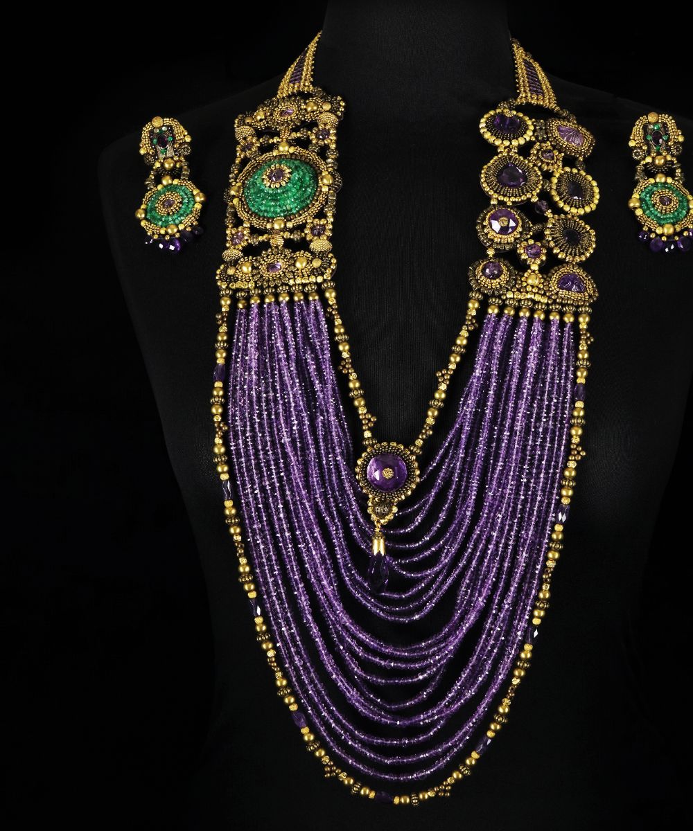 Amethyst Fantasy naga con ametiste di differenti tagli e perle di smeraldo; orecchini en suite, la collana l. cm. 70; gli orecchini h. cm. 8