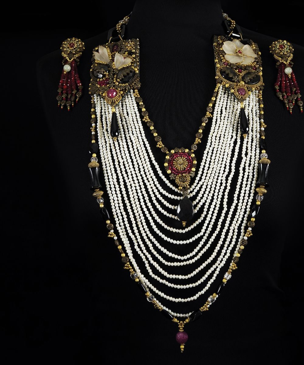 Fioritura di Cristallo naga con fiori in cristallo di rocca, rubini incisi e a perla, ossidiana, onice e perle di fiume; orecchini en suite, la collana l. cm. 62; gli orecchini h. cm. 10