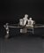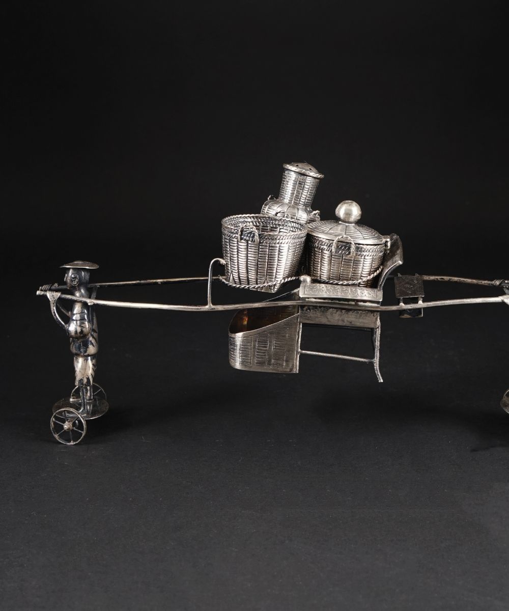 Servizio da tavolo in argento cesellato in forma di due orientali che sorreggono una portantina contenente una saliera, una pepiera e una mostardiera.