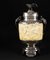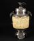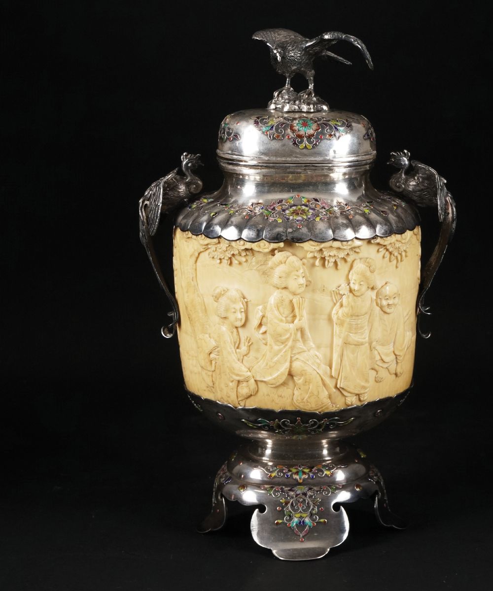 Coppa con coperchio in avorio scolpito a raffigurare scene con geishe; montatura in argento finemente decorato da smalti policromi; due anse a fenice; presa del coperchio in forma di volatile; quattro pieducci a voluta stilizzata.