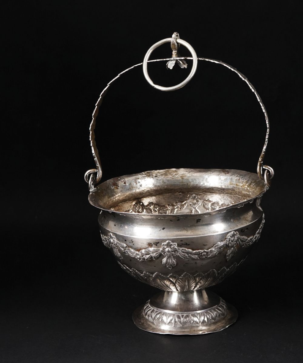 Secchiello in argento con corpo globulare sbalzato a festoni di foglie trattenuti da una corolla e foglie lanceolate; ansa mobile; piede circolare.